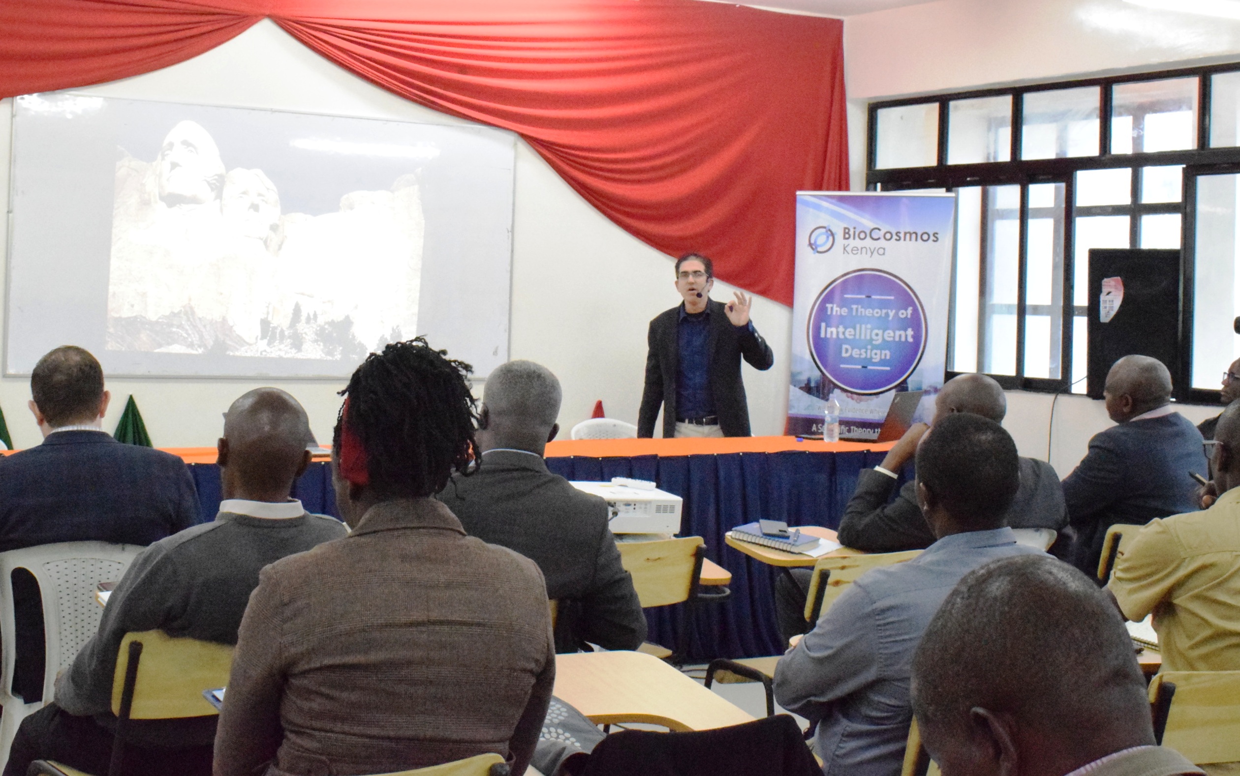 Exploratory discussion on ‘Question of Intelligent Design’ during public lecture on design and evolution held at the university with key speakers from BioCosmos - Dr. Casey Luskin, an expert in evolution and law, also Dr. Brian Miller, Research Coordinator from the Center for Science and Culture, Discovery Institute. Other topical areas of discussion included; engineering revolution in Biology, how planet shows evidence of design, thermodynamics, the origin of life and intelligent design among other areas. DVC- Research and Technology Development, Prof. Alfred Orina gave a keynote speech. He was accompanied by Executive Dean, Faculty of Applied Sciences and Technology - Prof. Francis Gatheri, Director, School of Physics and Earth Sciences, Prof. George Amolo, among other senior teaching staff.