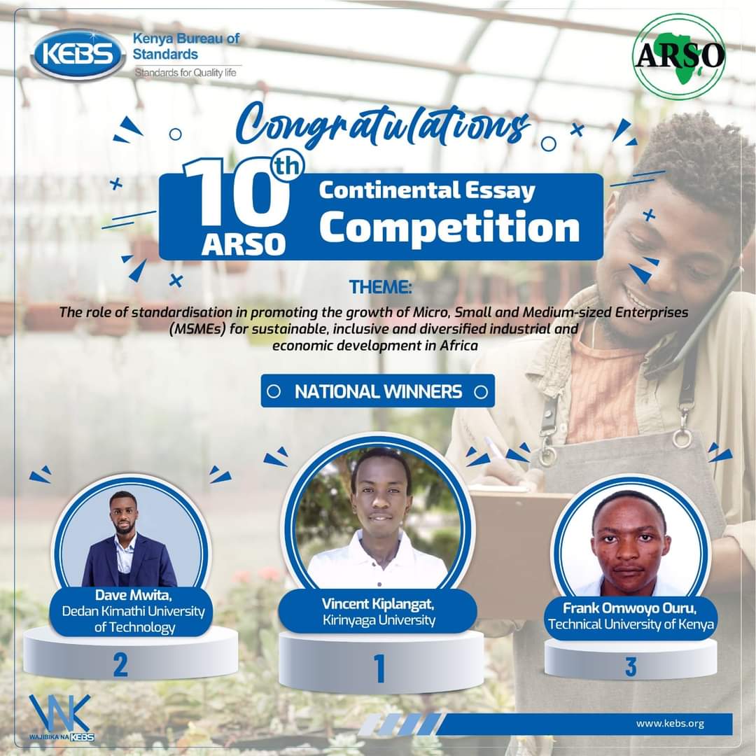 TUK student, Frank Omwoyo from the school of Chemistry and Material Science is among the winners of the 10th ARSO (African Organization for Standardization) annual essay competition both in the national and continental level. This year's essay competition was organized under the theme "The role of standardization in promoting the growth of micro, small, and medium sized enterprises(MSMEs) for sustainable, inclusive and diversified industrial and economic development" and was open for young adults below 35 years in colleges and universities. For his win, he will be be attending the annual ARSO conference to be held in DRC Congo where certificates and money will be awarded