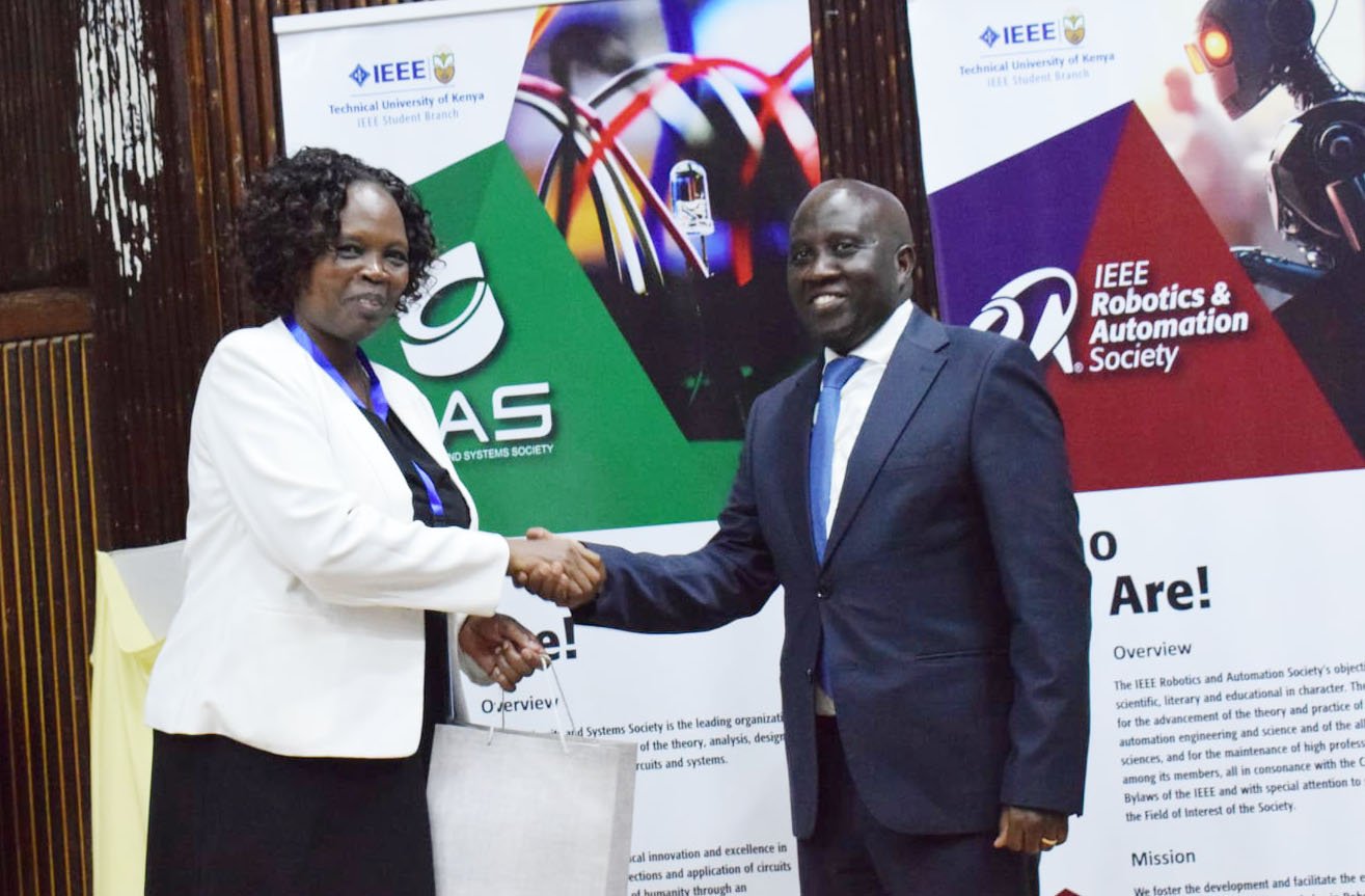 IEEE TU-K Patron Dr. Mary Ahuna gifts the Principal Secretary for Information, Communication, and the Digital Economy, Eng. John Tanui.